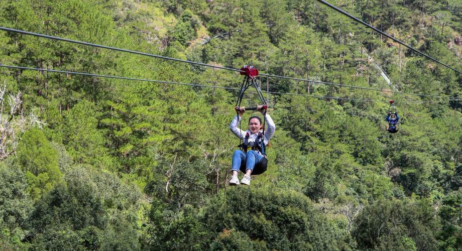 Tại đây, bạn sẽ trải nghiệm máng trượt xuyên rừng – từ đỉnh đồi trượt xuống qua rừng thông đến chân thác. Ngoài ra, bạn có thể thử zipline dài nhất Đông Nam Á và chiêm ngưỡng thác nước hùng vĩ.